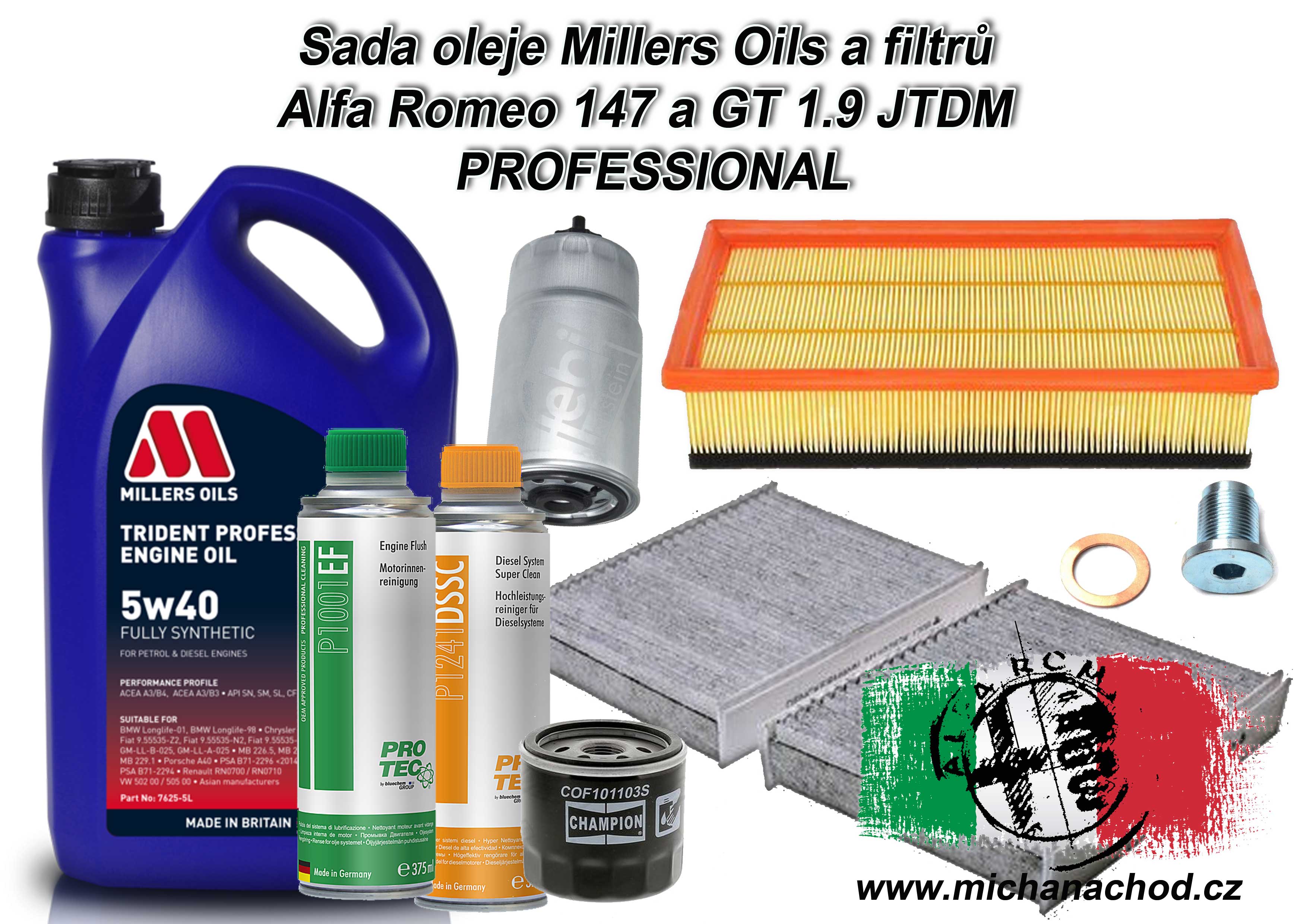 Sada oleje Millers Oils Trident Professional 5W40 včetně filtrů pro Alfu Romeo 147 a GT 1.9 JTD bez Filtru pevných částic.